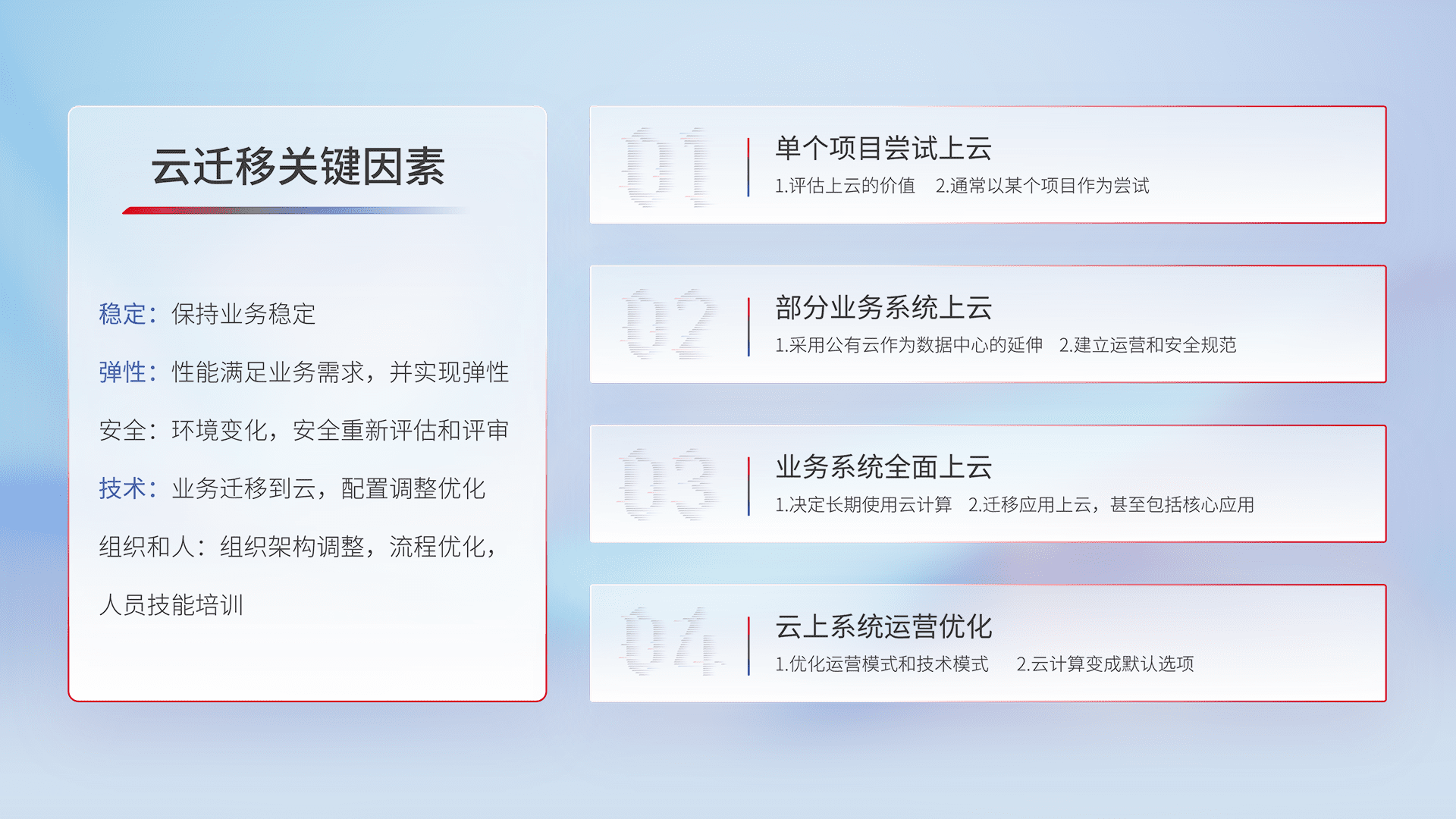 结合实际业务,,,从规划设计、、、云平台选型、、、、云原生改造、、、、数据迁移、、集成交付,,,,迁移全过程为客户识别最佳上云路径,,,做好风险识别管理,,,设计网络架构、、、、身份权限、、、、安全审计合规、、、、操作审计、、日志审计、、监控告警策略、、、、多站点容灾设计等,,,对云上基础设施进行整体规划,,,,提升IT治理水平,,,,以满足弹性、、高可用、、、高性能的需求。。。