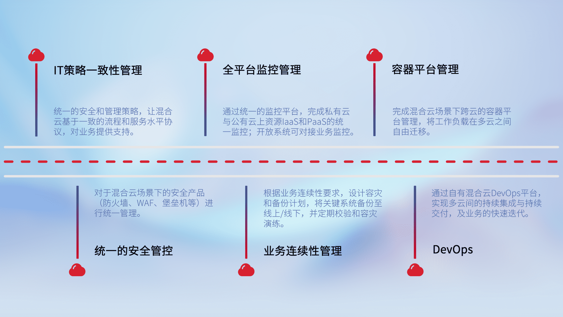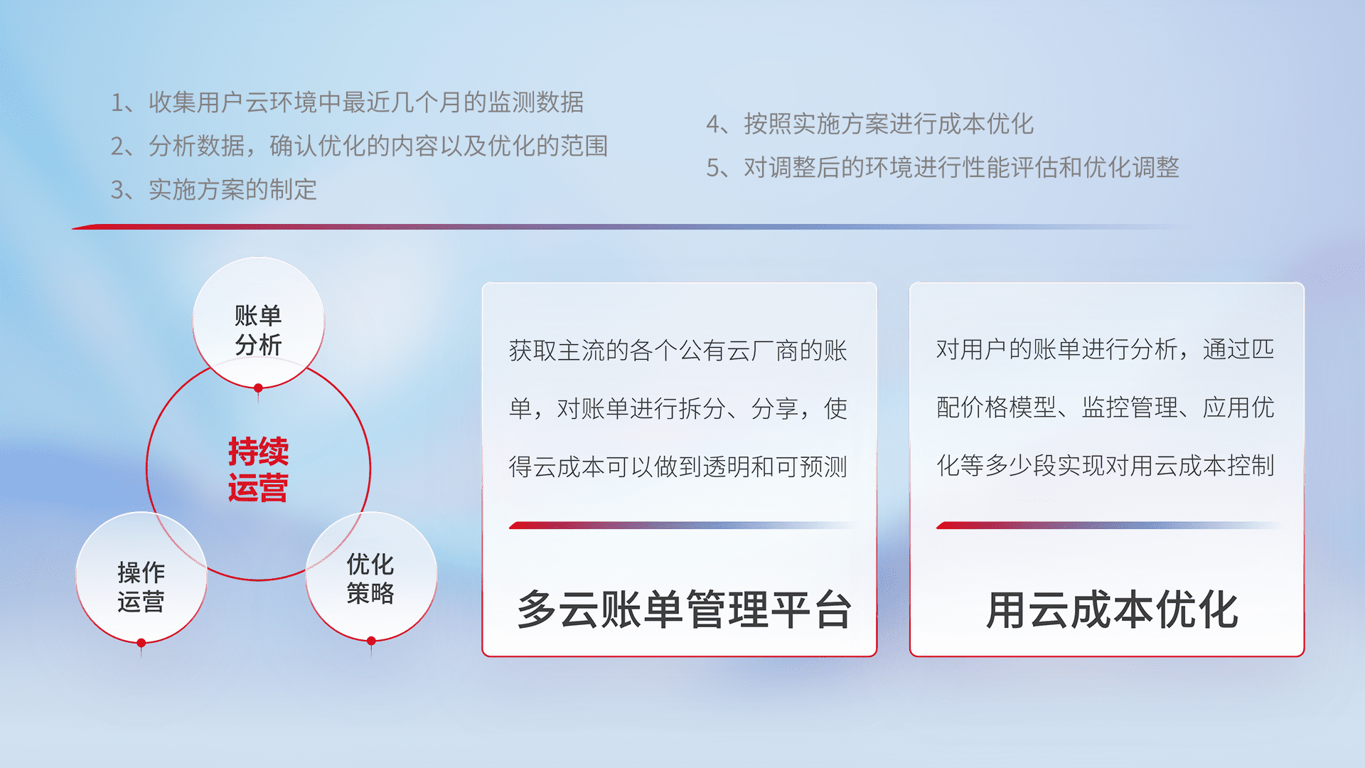 通过多云纳管,,,以统一的资源数据模型把客户的云资源进行抽象和封装,,,进而实现对多云资源的统一操作,,,保障云资源管理的可靠性、、、、稳定性与可用性。。量身定制化运维内容,,,配置、、开发运维、、、、补丁管理、、、、备份、、、监控、、、认证和访问管理、、、、审计和日常巡检等,,,保障在用云过程中的可靠度,,稳定度以及高可用率。。。。