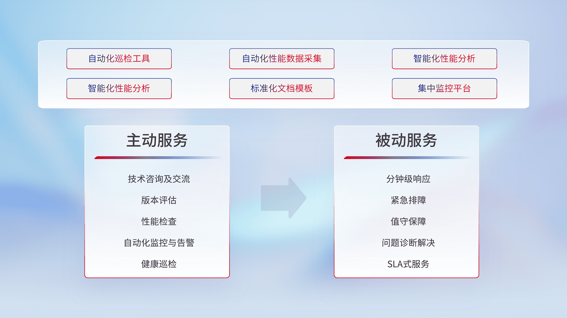 智能化工具和标准化文档,,,,保障服务质量,,提供主动服务(包含技术咨询、、版本评估、、、性能检查、、、自动化监控与告警、、、健康巡检)和被动服务包含(分钟级响应、、、紧急排障、、、、值守保障、、、问题诊断解决、、、、SLA服务)。。。