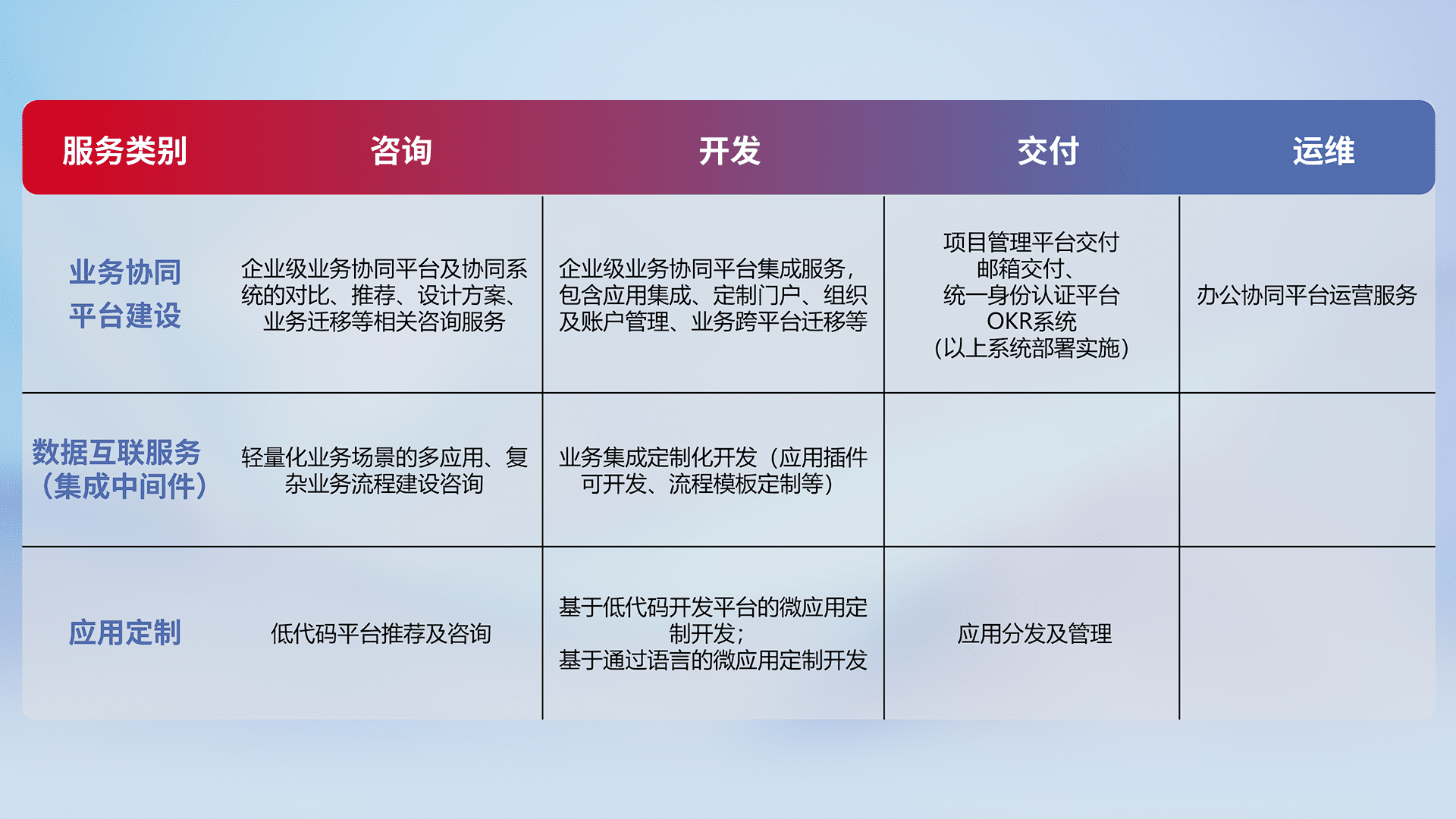 针对钉钉、、、、企微、、、、IDaas等平台级产品提供产品的规划、、、、方案、、交付、、定制化开发等服务,,实现如统一协同办公、、、智能客户服务、、混合会议管理、、智能数据查询、、、等业务场景,,,实现数字化转型。。。。